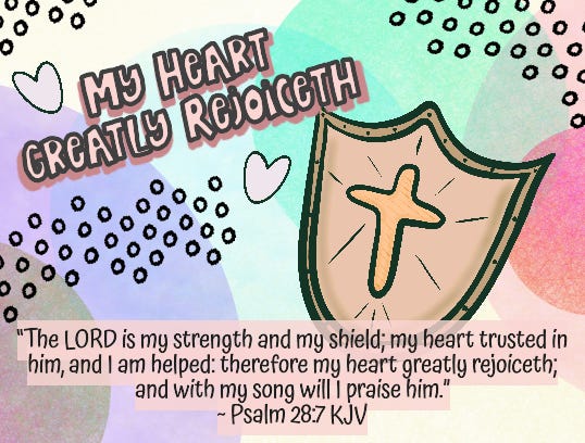 Verse: “The LORD is my strength and my shield; my heart trusted in him, and I am helped: therefore my heart greatly rejoiceth; and with my song will I praise him.” - Psalm 28:7 KJV