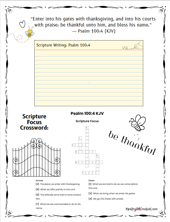 “Enter into his gates with thanksgiving, and into his courts with praise: be thankful unto him, and bless his name.”— Psalm 100:4 (KJV)